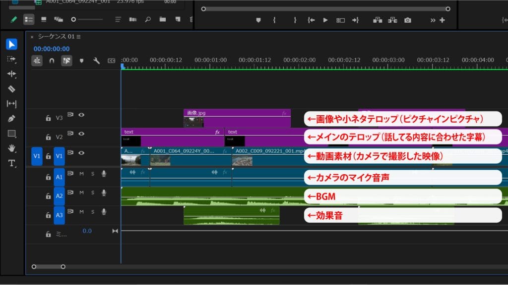 補足:テロップは「動画の上に乗せる」感覚です。タイムライン上では「映像より上のレイヤー(V2など)」に配置されます。
